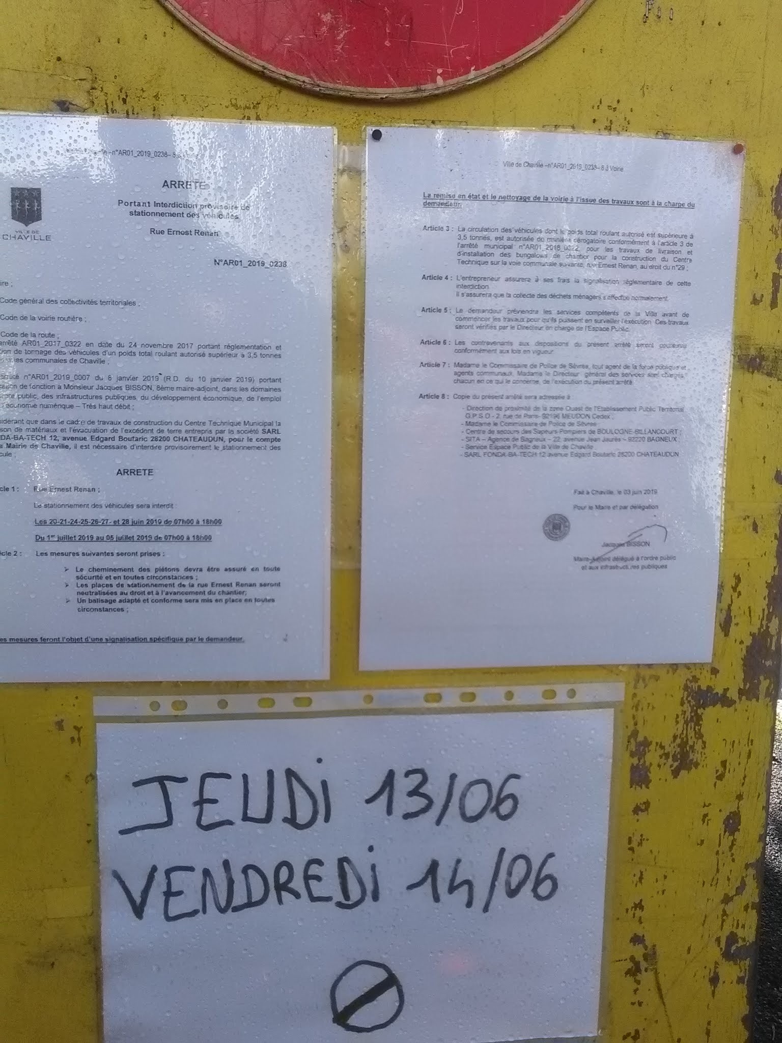 Ne respecte pas les horaires autorisant des travaux arrêtés par la mairie de Chaville, ni les jours d'interdiction de stationner pris par arrêté municipal du 3 juin 2019 par cette même mairie maître d'ouvrage rue Ernest Renan à Chaville . Camions roulant beaucoup trop vite sur un site dont les trottoirs ont été neutralisés pour les travaux.